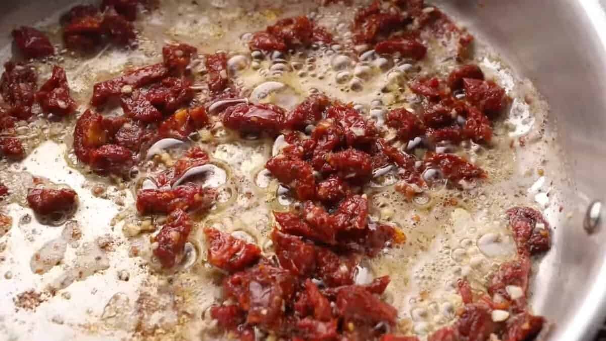 - Add the garlic and sun-dried tomatoes and cook for 1-2 minutes or until fragrant.